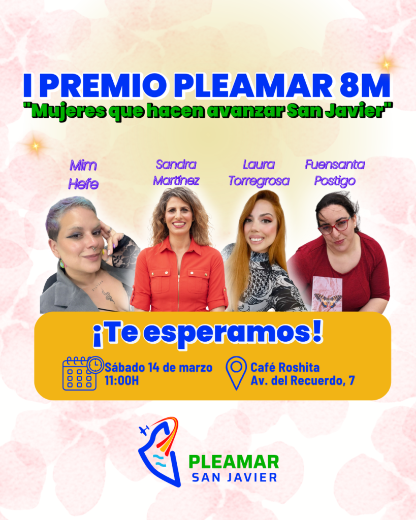 El partido municipalista de San Javier Pleamar celebrará mañana sábado a las 11:00 horas la primera edición de los Premios Pleamar 8M, un acto con el que se pretende reconocer públicamente la trayectoria, el compromiso y la contribución de diversas mujeres del municipio de San Javier.